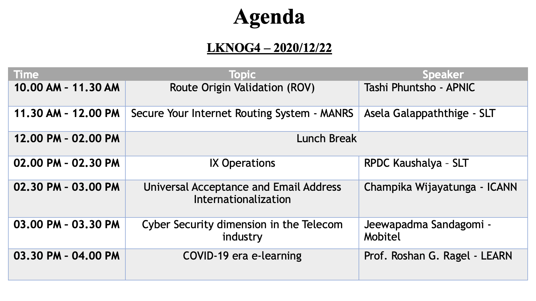 Lanka Network Operators Group (LKNOG) is a non-profit, community based initiative to bring the network operators and networking professionals in Sri Lanka together in terms of educational, knowledge sharing and collaborative aspects. The objective of this forum is to provide a local & regional platform to discuss operational issues and technologies that interests network operators in Sri Lanka and in South Asia. This initiative also aim to unearth local talent and resource personnel from Sri Lanka who will be keen to contribute towards capacity building and knowledge sharing activities at large.